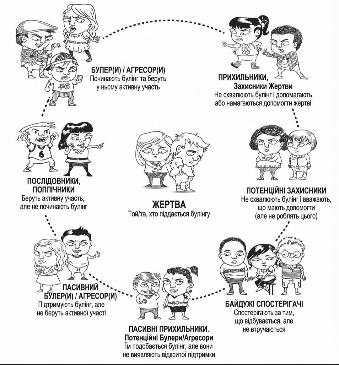 “Коло булінгу” Дана Ольвеуса, основоположника вивчення булінгу. Чому нам важливо говорити про булінг як “хворобу групи” та розглядати динаміку булінгу? Бо робота лише з нападником та мішенню, яка пропонується у нас здебільшого – це як до сраки карі очі. Булінг є проблемою групи, і працювати треба саме з групою. Булінг — це не конфлікт двох